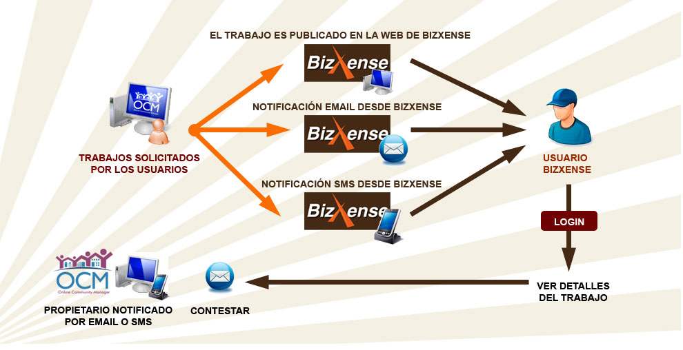 Todos los usuarios de OCM tienen acceso a una página de servicios, donde pueden buscar un proveedor de servicios en BizXense, o describir su problema e insertarlo en nuestro sistema web. Tan pronto como el trabajo sea publicado, se te notificará por correo electrónico y SMS. Podrás iniciar sesión para ver los trabajos y realizar consultas y, en el caso de aceptar el encargo, podrás ser recomendado a todos los vecinos y administradores.